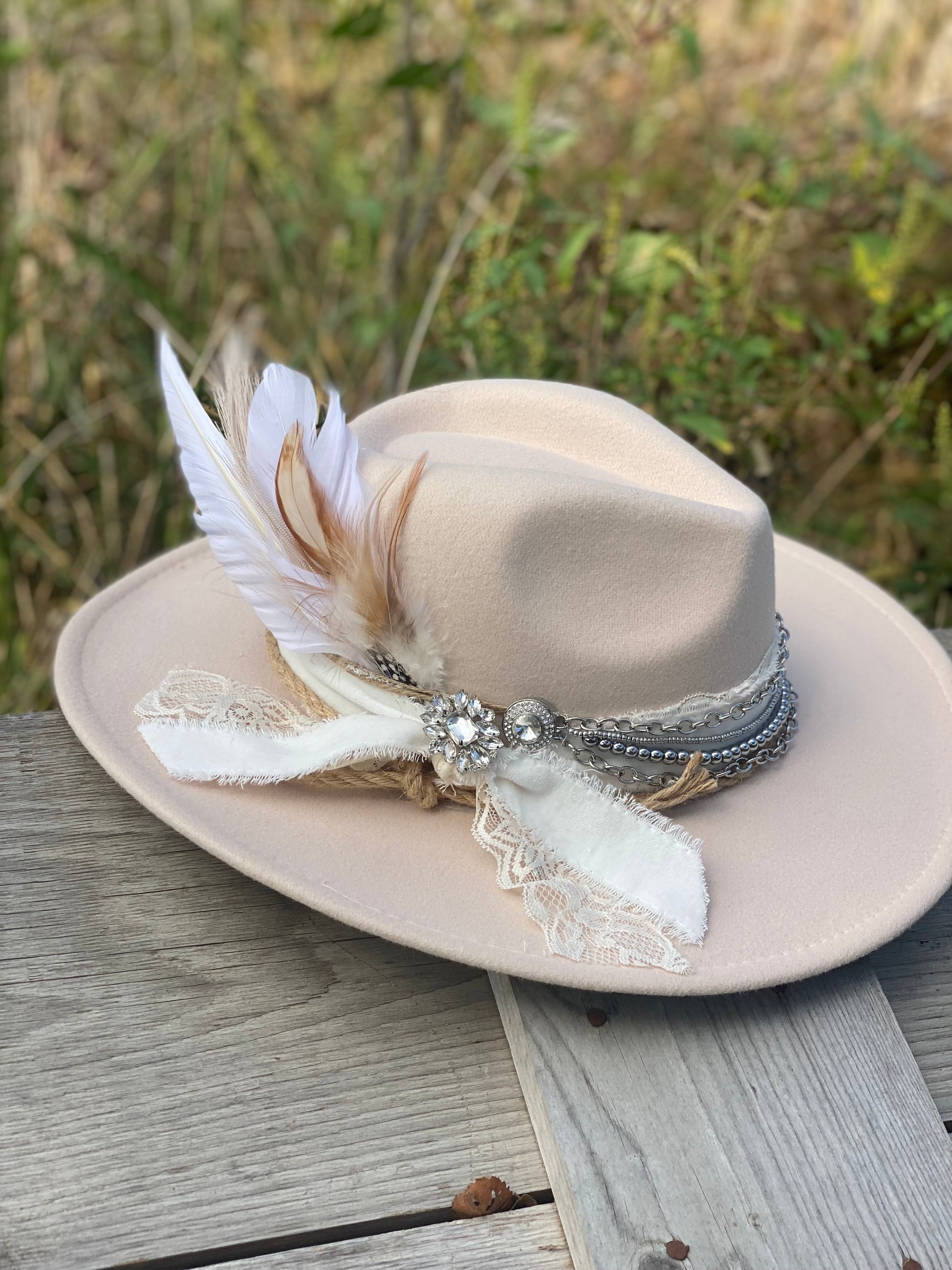 Expertly crafted, The Rhinestone Cowgirl is a stunning hand beaded beige ladies flatbrim. With feathers, pompas grass, rhinestones, lace, and ribbon, this hat is perfect for any occasion. Boasting neutral tones, it adds a touch of elegance to any outfit.
